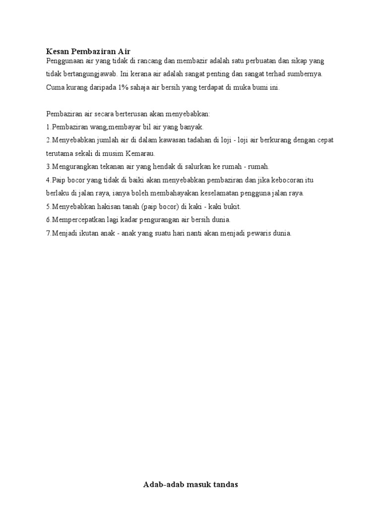 Contoh Karangan Pembaziran Air By Vi_Alayna975 08 Aug, 2022 Post a Comment Karangan Jenis Fakta Kepentingan Air Pdf Kesan Pembaziran Air Pdf Kepentingan Air Pdf Contoh Karangan Pdf Koleksi Karangan Ramalan Upsr 2016 Pdf Share No comments for "Contoh Karangan Pembaziran Air"